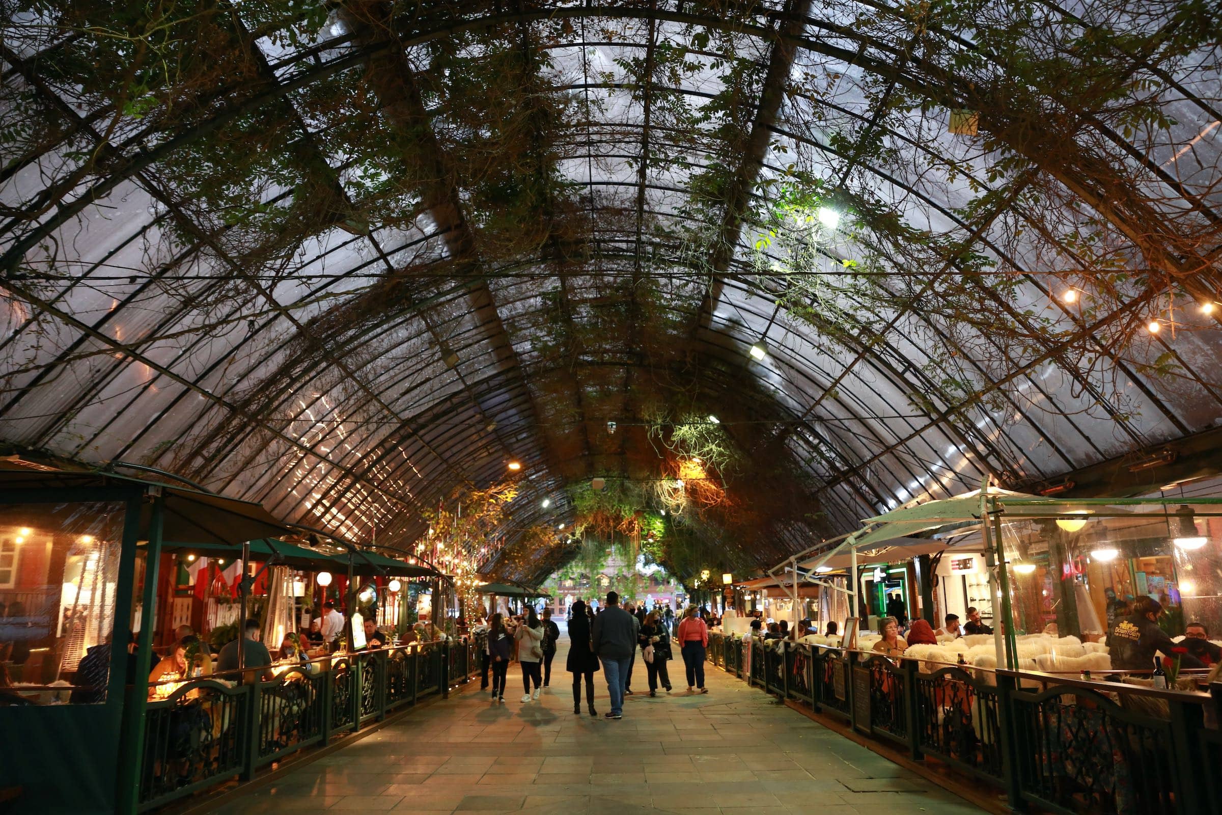 A charming covered street lined with shops and cafes, offering a cozy atmosphere for dining and people-watching.