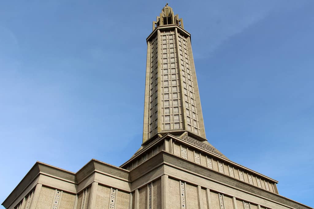 A striking modernist church with a towering lantern spire, a symbol of Le Havre's rebirth.