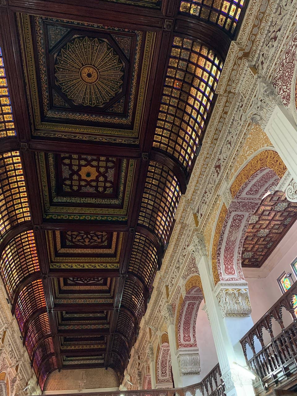 The library is a beautiful example of Indo-Saracenic architecture, with significant Mughal and Hindu influences, featuring intricate carvings and stained glass.