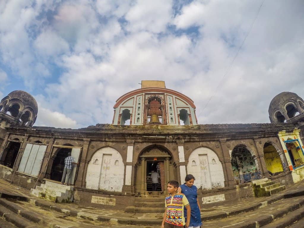 The temple features beautiful architecture with intricate stone carvings and sculptures, reflecting historical Maratha influences.