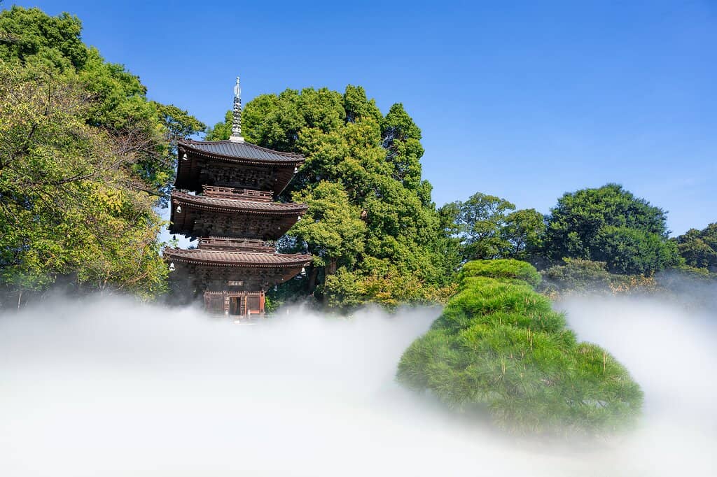 Marvel at the ancient three-story pagoda, a stunning historical centerpiece within the serene garden grounds.