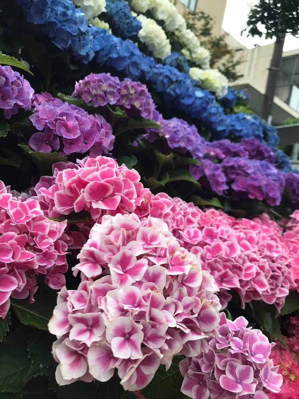"Beautiful hydrangeas when in season. Pastel and bold colours and different species/varieties.