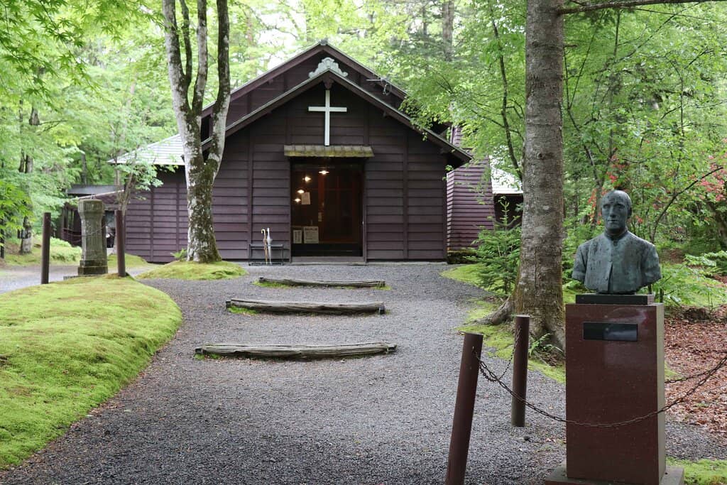 A historic wooden church nestled in a serene forest grove, offering a peaceful retreat and a glimpse into Karuizawa's past.