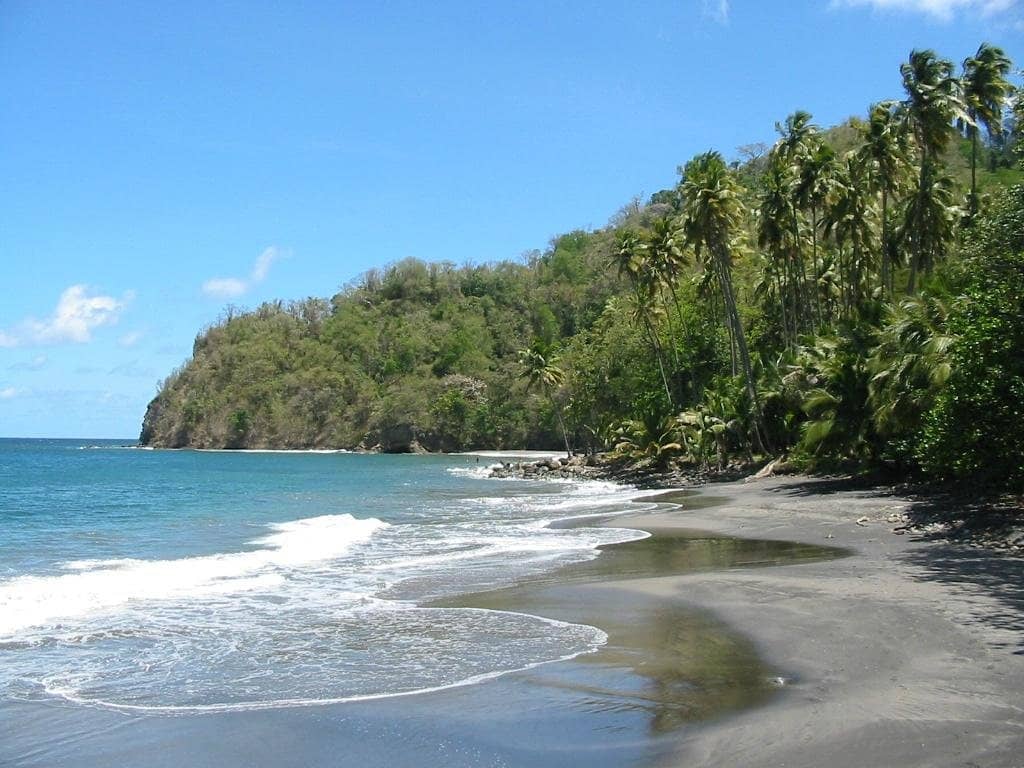 Experience the striking contrast of dark volcanic sand against the turquoise Caribbean Sea.