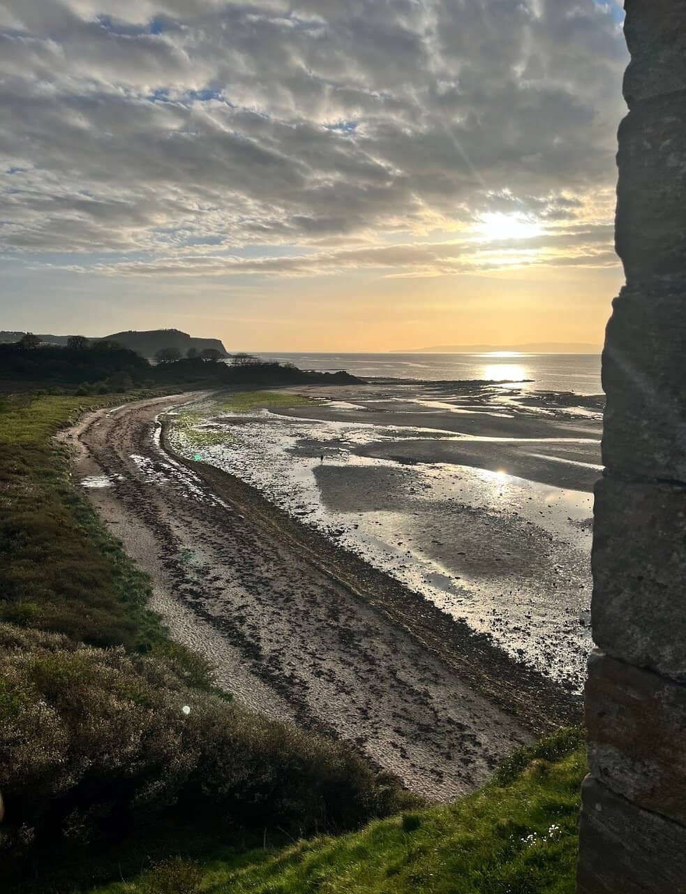 Main car park was marsh land which made it tricky to access beach. But if you walk to the left towards the castle and stay in the grass, you can access beach further down. The beach was covered in seaweed, debris and a lot of huge dead jellyfish. Not anyone's fault on course but be aware. My dog went straight the rotten carcass of a small seal/dolphin on the beach. Lovely walk to the ruins - there are pathways through the dunes as well as on the beach. Great views of the castle from the beach and great views of the bay. Worth a visit and it's free."