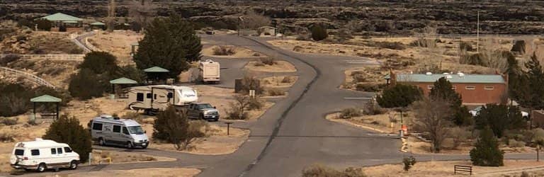 "Just stayed one night as we passed through but a REALLY cool spot in the remains of a lava flow. Highly recommend the nature walk. Long spots with 50amp/water for our RV and tow. A bit tight to turn in the campground but navigable. It is on the desert so there is no shade."