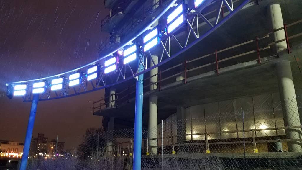 A dazzling downtown riverfront park featuring interactive, color-changing light installations that illuminate the night.