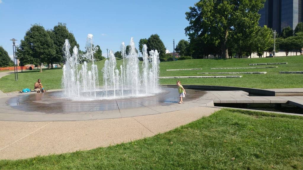 Jordan Valley Park offers a variety of activities, including playing in the Ozarks Stream and Fountain, exploring art installations, picnicking, and enjoying the open green spaces. There's also a small playground.