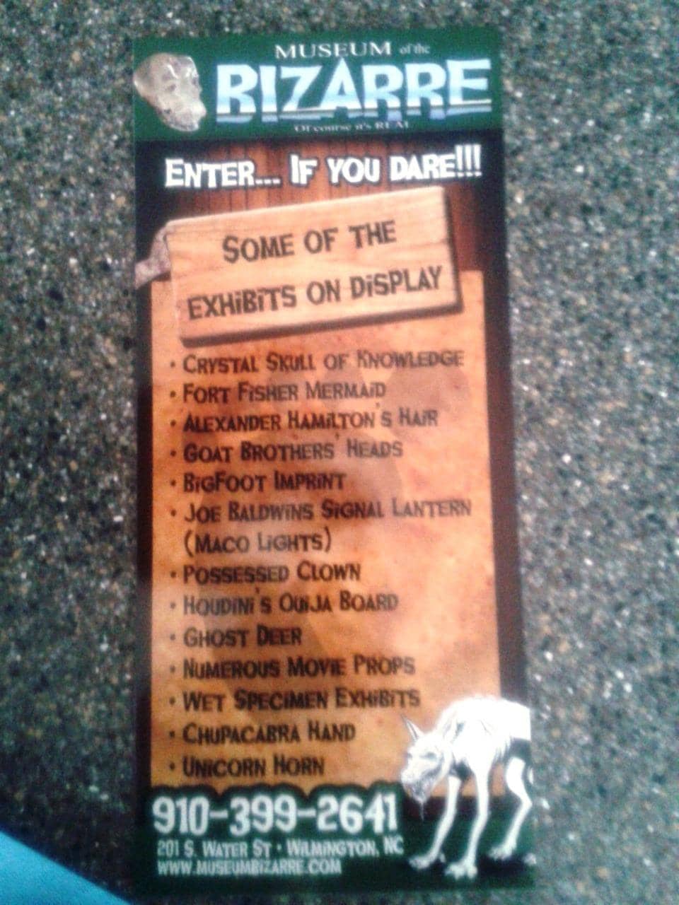 The Museum of the Bizarre is located in downtown Wilmington, NC, right on the Cape Fear Riverwalk. Street parking is available.