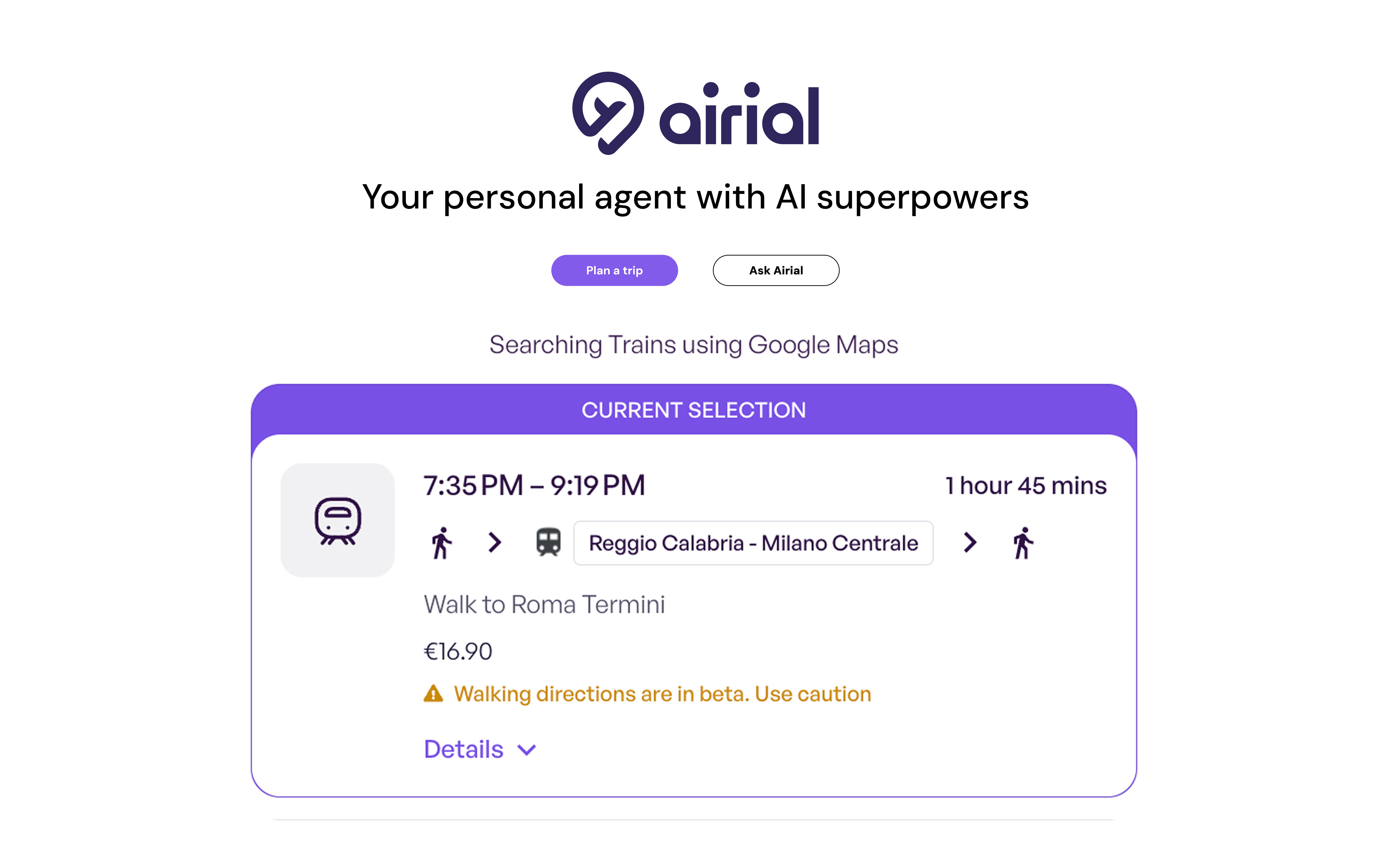 After you create a trip with Airial, simply click the small train icon displayed between two Destination Cards. This opens a panel showing all transit options between those cities. And it doesn’t stop there. For navigating within a city, you can open the full itinerary, view/click the default transit option, and switch to your preferred choice with a single click. This means Airial can now pick — with precision — every connection needed for a seamless transit.