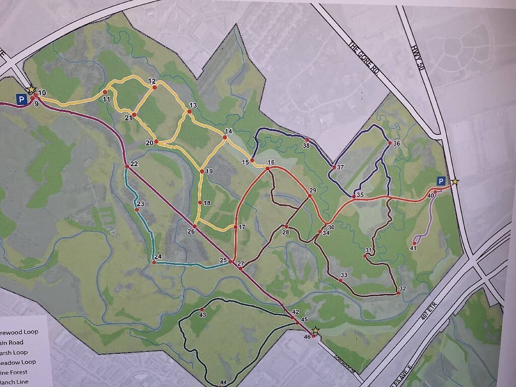 "There are three entry points with parking spaces (no fees, and this one has adequate space even on Sunday as the trails open to the surrounding Neighborhood). In general, you will be all right if you follow the map (other hiking site could be wrong as no return loop once you crossed the concrete bridge to the parking lot when you travel along 407). Plenty of things to explore and more enjoyable once you are away from the main road."