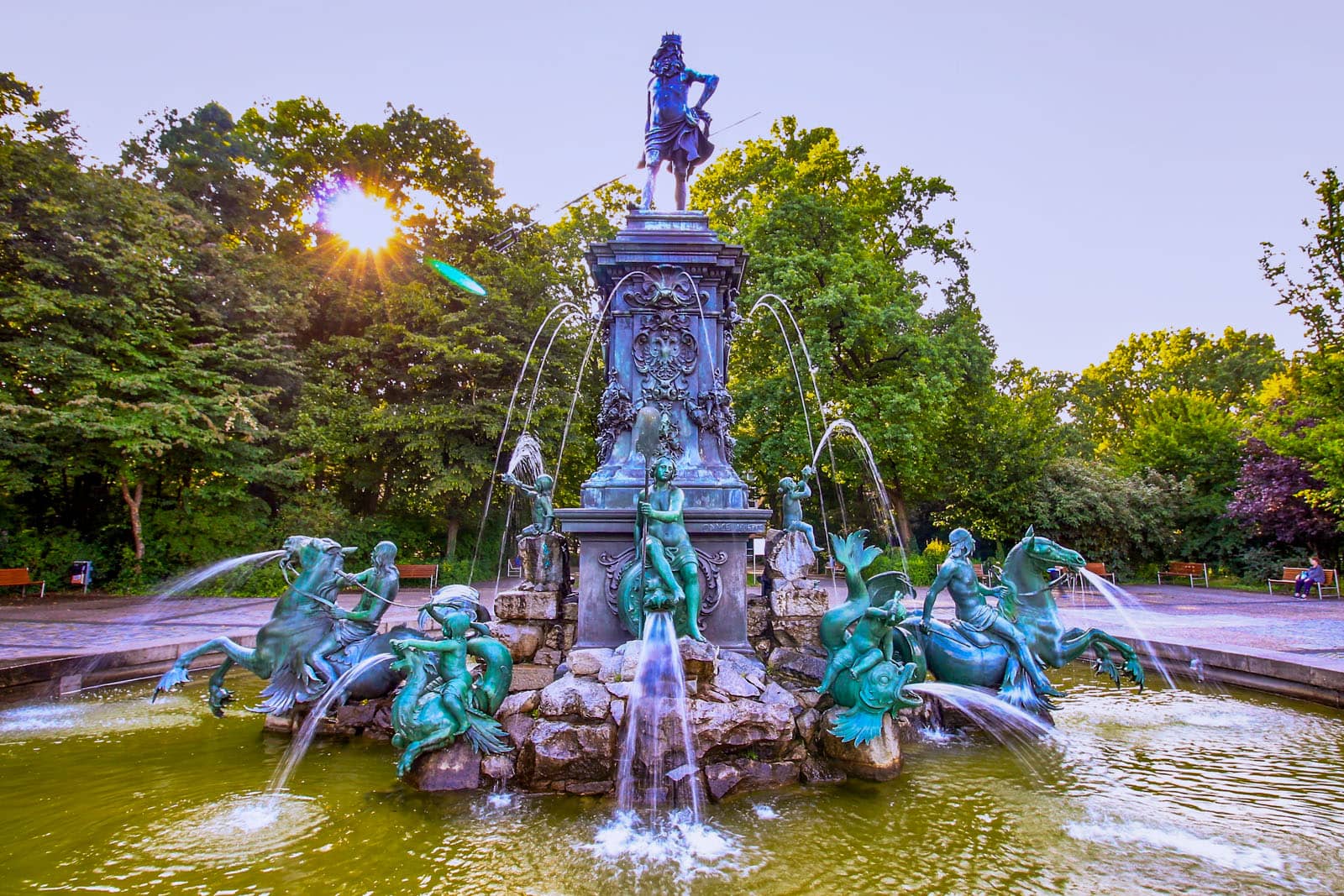 Nuremberg's expansive green oasis, featuring the Neptune Fountain, a serene pond, vibrant seasonal blooms, and lively events.