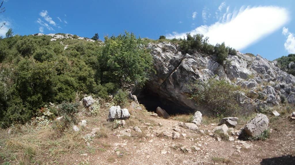 The area around the cave entrance offers stunning 180-degree panoramic views of the surrounding mountains and the Corinthian Gulf.
