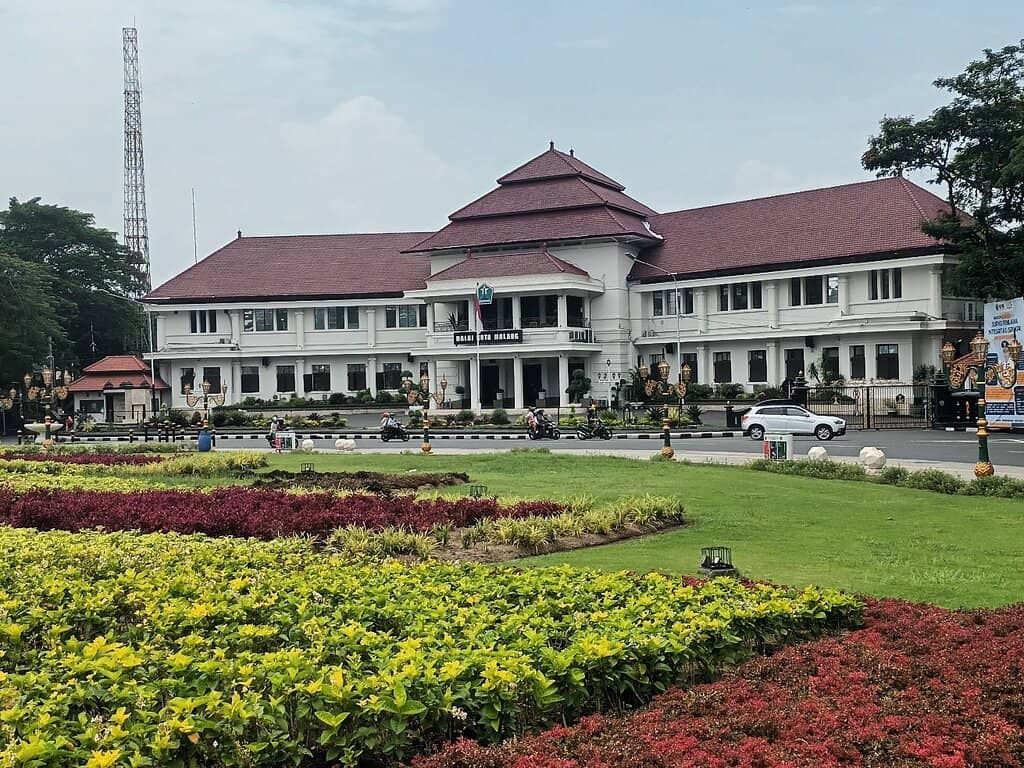 Historic Dutch colonial building at the heart of Malang, surrounded by beautiful gardens and the iconic Tugu Monument.