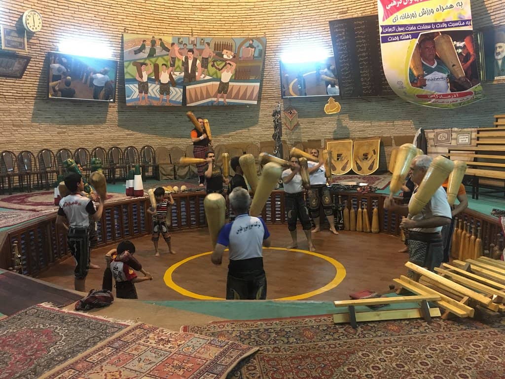 The exercises are performed in a circular arena called a morshed, with a musician at the center who leads the session with drumming and epic poetry recitation. Athletes, known as pahlavans (heroes), engage in a series of movements designed to build strength, flexibility, and stamina. These include push-ups, squats, and the use of heavy wooden clubs (meel) and shields (kabad).
