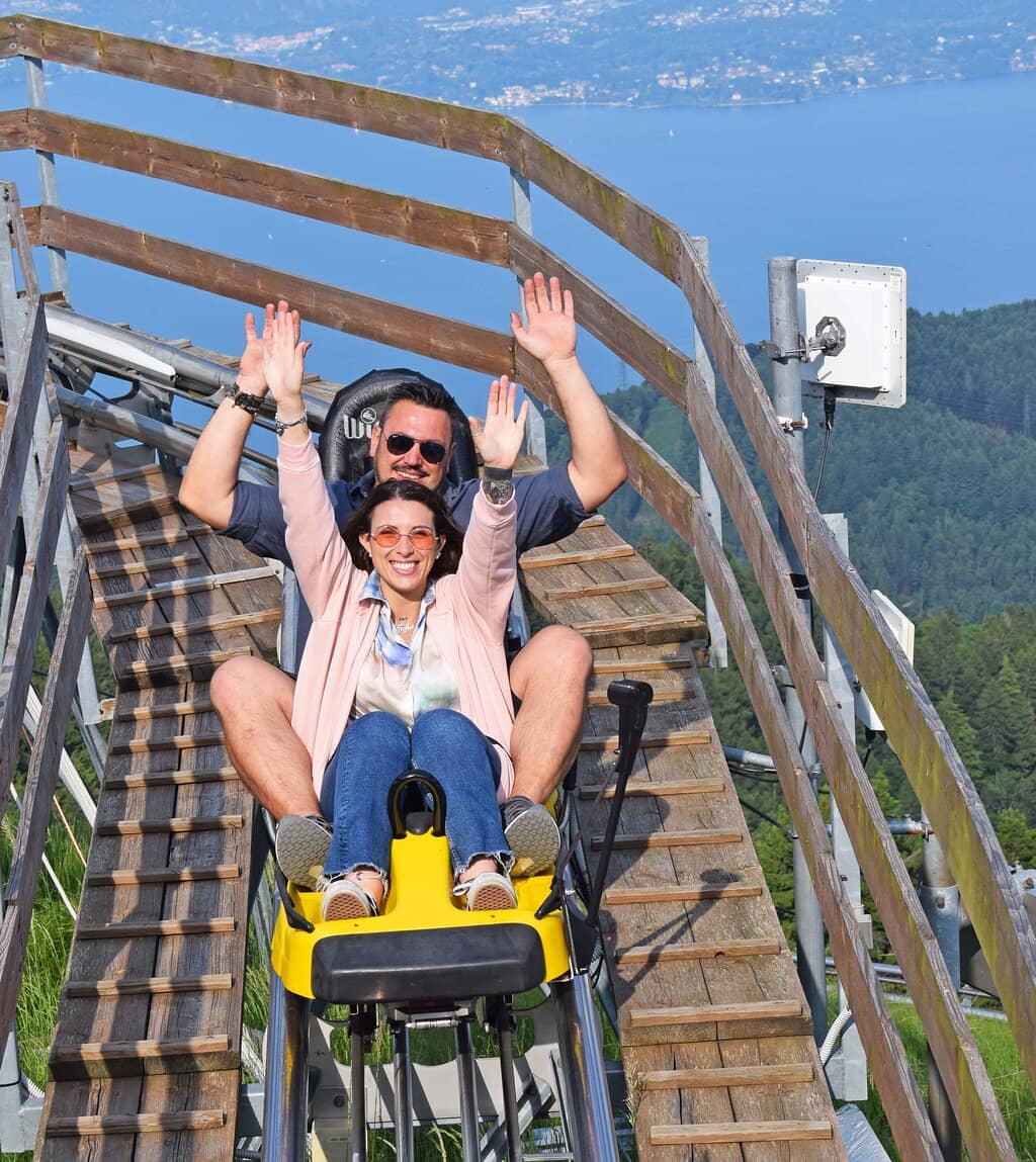 An alpine coaster on Mottarone mountain offering thrilling rides with breathtaking panoramic views of the Alps and lakes.