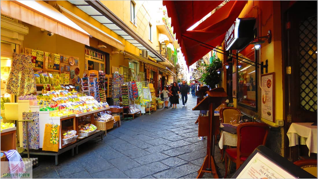 Sorrento's bustling pedestrian heart, lined with souvenir shops, limoncello vendors, and gelaterias. A vibrant street for shopping and soaking in local life.
