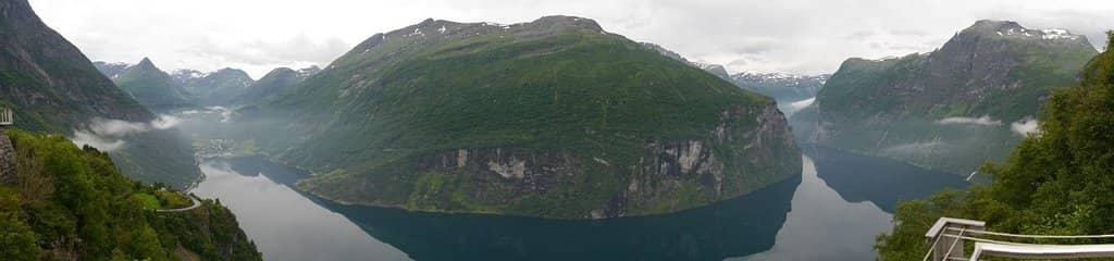 Marvel at the breathtaking, sweeping views of the Geirangerfjord, its deep blue waters, and surrounding dramatic mountains.