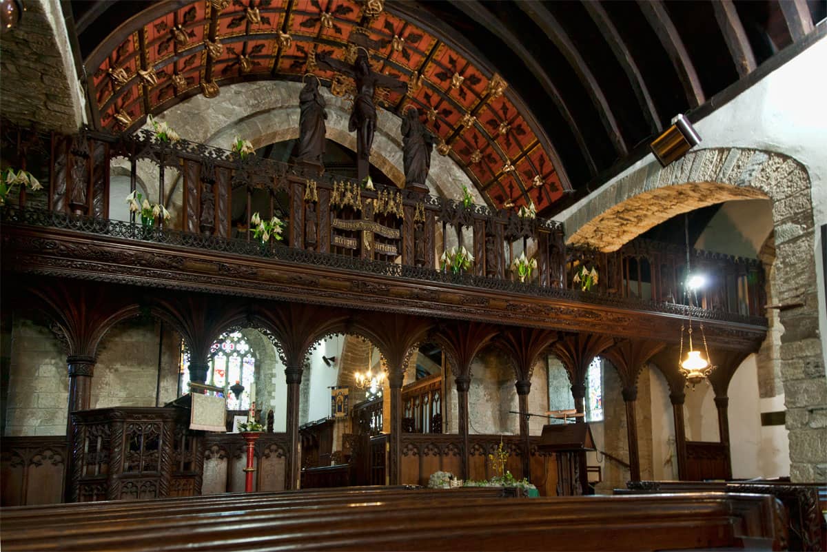 Inside Crantock Church, don't miss the incredibly beautiful interior, the magnificent Rood Screen, excellent bench ends, misericord seats, and the Reredos.